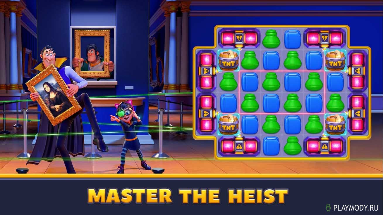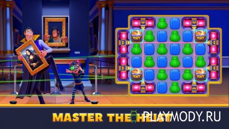 Match Villains предлагает вам попробовать себя в воровском деле и не просто попробовать, а стать лучшим в своем деле. Приобрести опыт в этом непростом и рискованном деле вам поможет семья аристократов: граф, его дочь и их дворецкий. Вас ждет множество заданий-ограблений. На каждом уровне оно новое, еще более сложное и опасное, да еще и многослойное. Справлять с ними вы будете с помощью умных совпадений и хитромудрых комбо. Но есть в игре и коллекция усилений, разблокировав которые вы сможете справиться со всеми заданиями. В общей сложности вам предстоит пройти через пятьдесят сложных уровней. Каждый из них откроет вам кусочек увлекательной истории воровской семьи, изображенной на красочно оформленных плакатах.