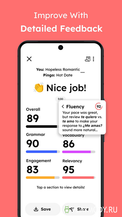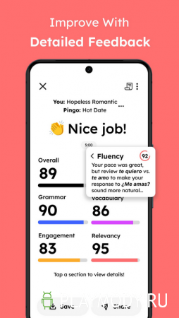 Pingo AI современный метод изучение более 15-ти иностранных языков. Метод строится сразу на двух направлениях изучения выбранного языка. Первый (режим «Репетитор») – изучение и практика основ. Второй – интерактивные «живые» беседы со встроенным ИИ. Плюс второго режима в следующем: полная имитация носителя языка и подстраивание под пользователя. Можно даже построить общение, как с другом: задавать любые вопросы, обсуждать разные темы (какие интересуют, а не те, что предлагает ИИ), делиться проблемами – и все на иностранном языке. Такая методика позволяет постепенно избавиться от языкового барьера, и начать общаться без страха с иностранцами. После каждого урока (или беседы) можно получить полноценную обратную связь: какие ошибки были совершены, вовлеченности в урок, список словарных слов для самостоятельного обучения.